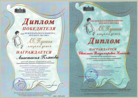 Среди победителей XXI Международного конкурса детского рисунка «А.С.Пушкин глазами детей» обучающаяся Детской художественной школы города Орла - Пьянова Анастасия (преподаватель Кононова Светлана Владимировна)