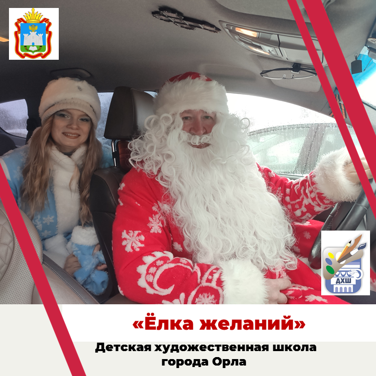 Шествие Дедов Морозов и Снегурочек продолжилось участием в ставшей традиционным предновогодним мероприятием "Ёлке желаний". Дедушка Мороз и Снегурочка отправились с подарками, чтобы исполнить мечты детей. Это настоящий марафон добра, в котором исполняются желания детей, находящихся в трудной жизненной ситуации. Детская художественная школа города Орла вновь стал участником этой акции. Дед Мороз и Снегурочка, в роли которых выступили представители школы, посетили семьи, принявшие участие в акции. Они вручили долгожданные подарки, принесли радость и ощущение новогоднего чуда в дома, где особенно остро нуждаются в поддержке и внимании.