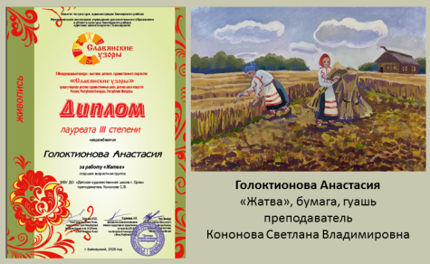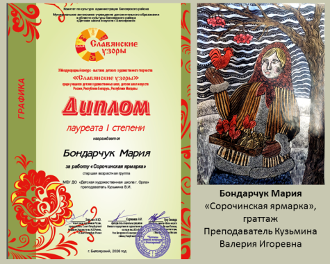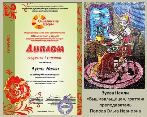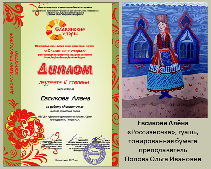 Поздравляем обучающихся Детской художественной школы города Орла с победой в XI Международном конкурса "Славянские узоры" среди учащихся ДХШ, ДШИ России, Республики Беларусь и Республики Молдова!