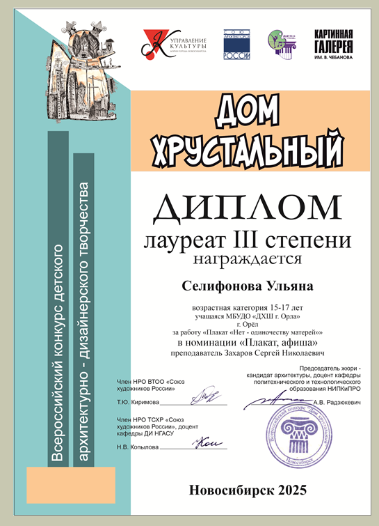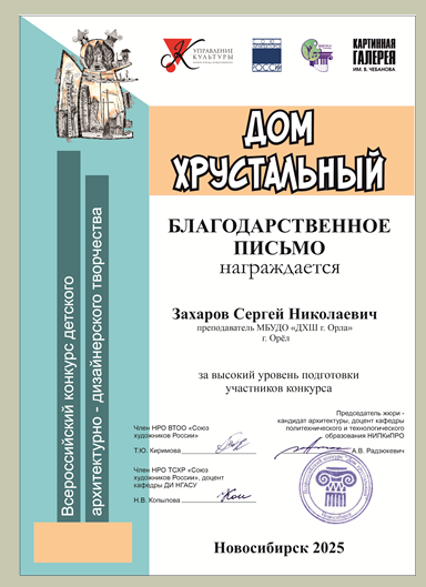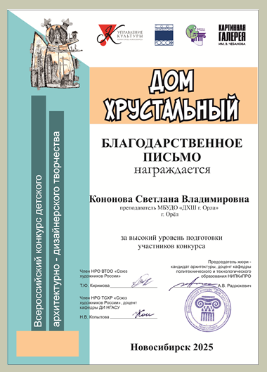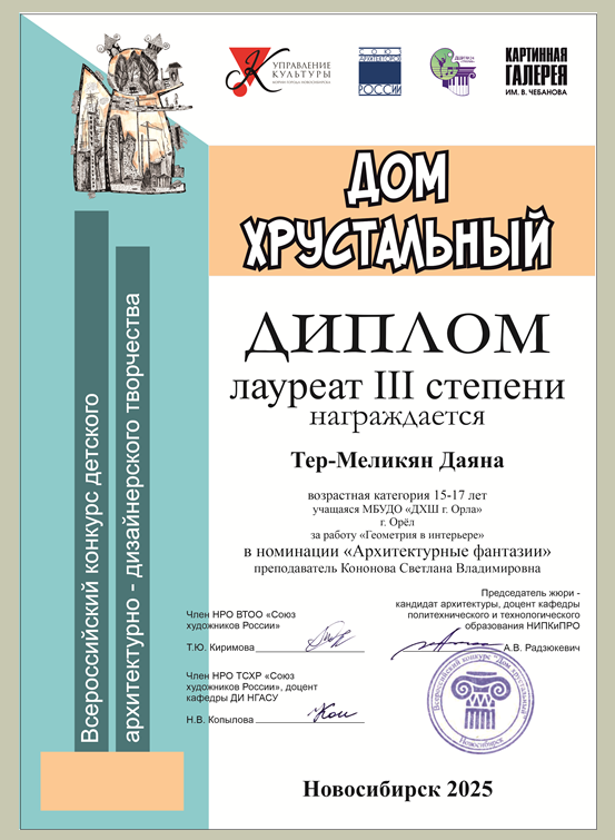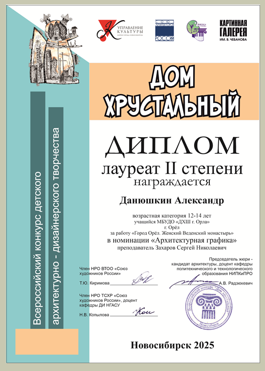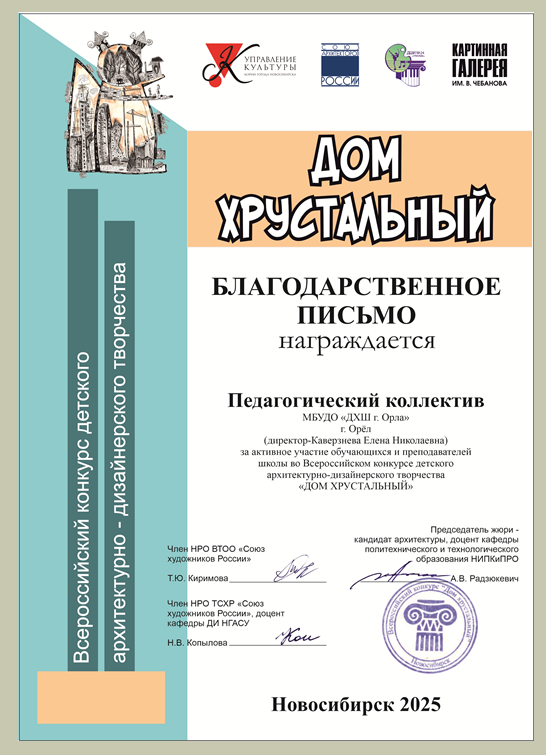 Обучающиеся Детской художественной школы города Орла стали победителями Всероссийского конкурса детского архитектурно-дизайнерского творчества "Дом хрустальный", проводившего в городе Новосибирске.