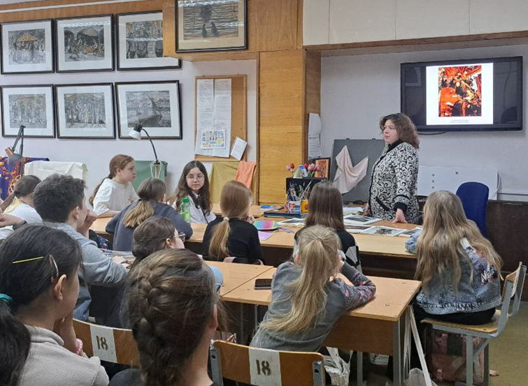Эта познавательная перемена была посвящена Дню Защитника Отечества. Она рассказала обучающимся 1-2-х  классов об истории праздника, о защитниках нашего Отечества разных времен. Продемонстрировала презентацию картин отечественных художников по  теме беседы.