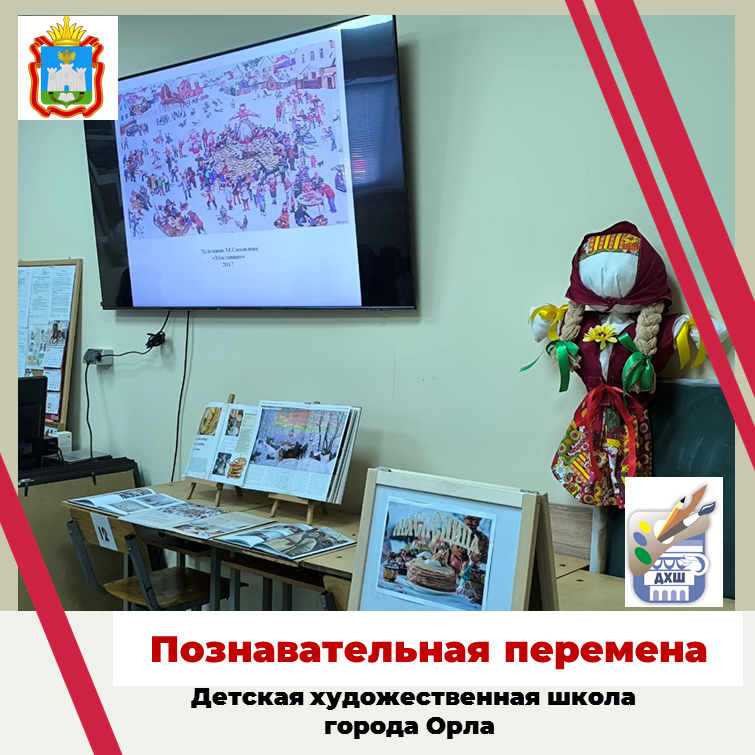 Перемена в школе - это не только время для отдыха. Они могут приносить новое знание. Так считает библиотекарь учреждения Зимина Ольга Викторовна, которая провела 13 февраля 2026 года для обучающихся 3-4 классов беседу с обучающимися на тему "Масленица в произведениях Русских и Российских художников". Участники мероприятия узнали о традициях празднования масленица, познакомились с масленичным календарём и посмотрели ряд картин, посвящённых этому празднику.