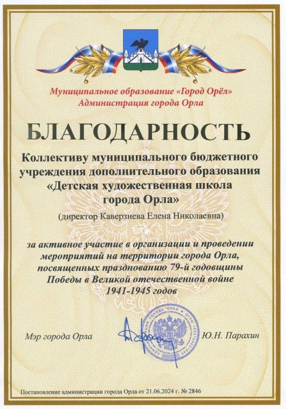 Коллектив Муниципального бюджетного учреждения дополнительного образования «Детская художественная школа города Орла» награждена Благодарностью мэра города Орла за активное участие в организации и проведении мероприятий на территории города Орла, посвящённых празднованию 79-й годовщины Победы в Великой отечественной войне 1941-1945 годов.