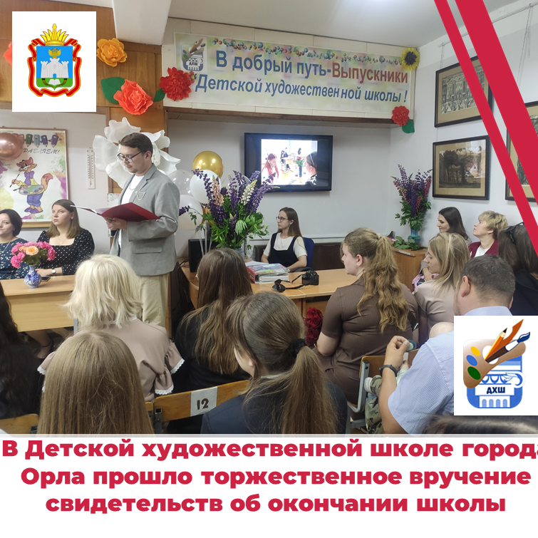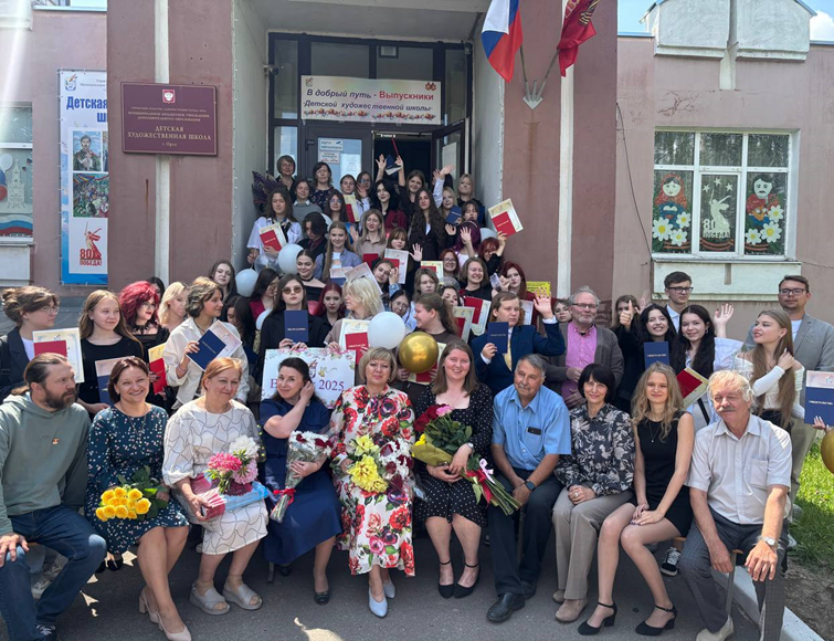 19 июня 2025 года в Детской художественной школе города Орла состоялось торжественное вручение свидетельств об освоении дополнительных предпрофессиональных программ в области искусств. В этом году школа выпустила 55 обучающихся, из них 21 выпускник окончил своё обучение только на "отлично".