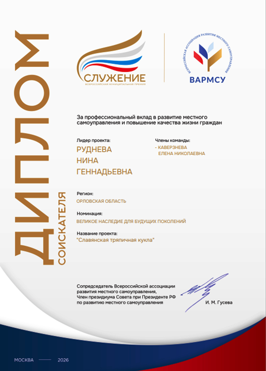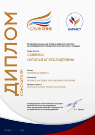 Детская  художественная школа города Орла приняла участие во Всероссийской муниципальной премии «Служение» в номинации ВЕЛИКОЕ НАСЛЕДИЕ ДЛЯ БУДУЩИХ ПОКОЛЕНИЙ. Участниками стали преподаватели Саввина Наталья Александровна и Руднева Нина Геннадьевна.