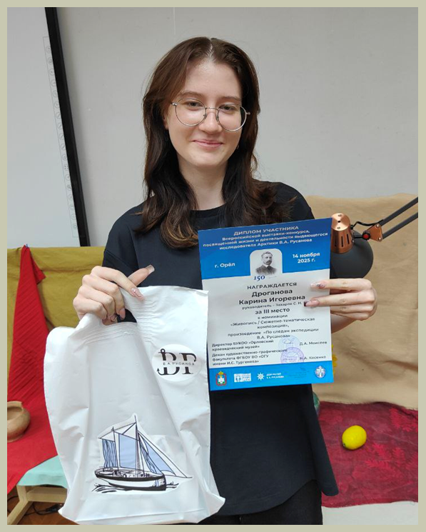 2-е место: Кондаурова Валерия Владиславовна (живопись/сюжетно-тематическая композиция) ( преподаватель Карманова Е.Н.) 3-е место: Блынская Александра Юрьевна (графика/сюжетно-тематическая композиция), сюжетно-тематическая композиция) (преподаватель Захаров С.Н.)