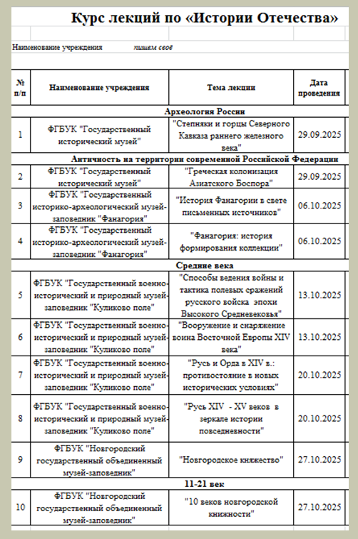 Министерство культуры Российской Федерации в сотрудничестве с федеральными музеями реализует масштабный образовательный проект – курс лекций по «Истории Отечества». Этот уникальный цикл лекций предназначен для широкого использования учреждениями культуры – музеями, библиотеками, домами культуры, детскими школами искусств, музыкальными школами и многими другими организациями, стремящимися расширить культурный кругозор своих посетителей и сотрудников. Курс лекций отличается инновационным подходом к подаче материала. Трансляции ведутся в режиме реального времени непосредственно из экспозиционных залов музеев, фондохранилищ, а иногда даже из живописных парков, что позволяет слушателям визуально соприкоснуться с историей, рассматривая наиболее ценные и редкие музейные экспонаты.