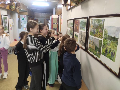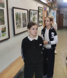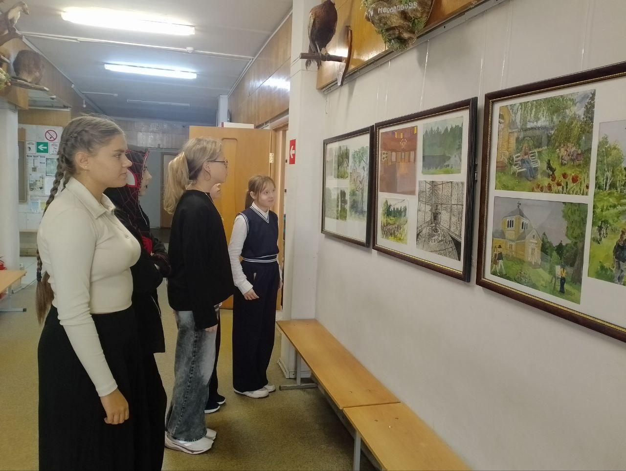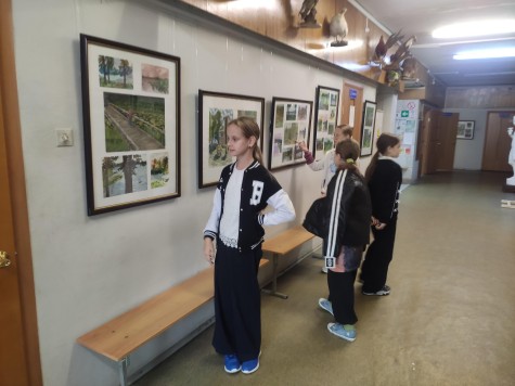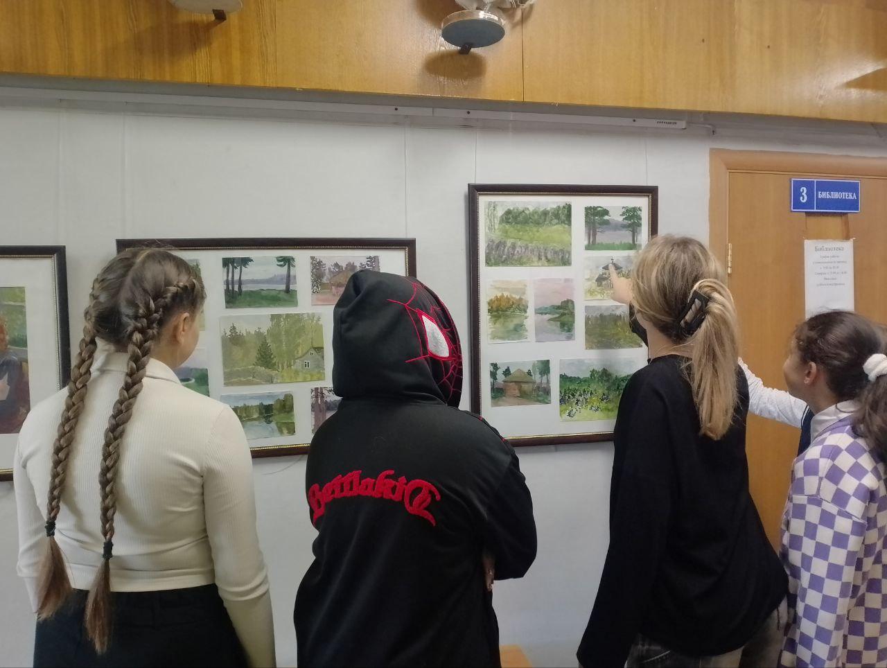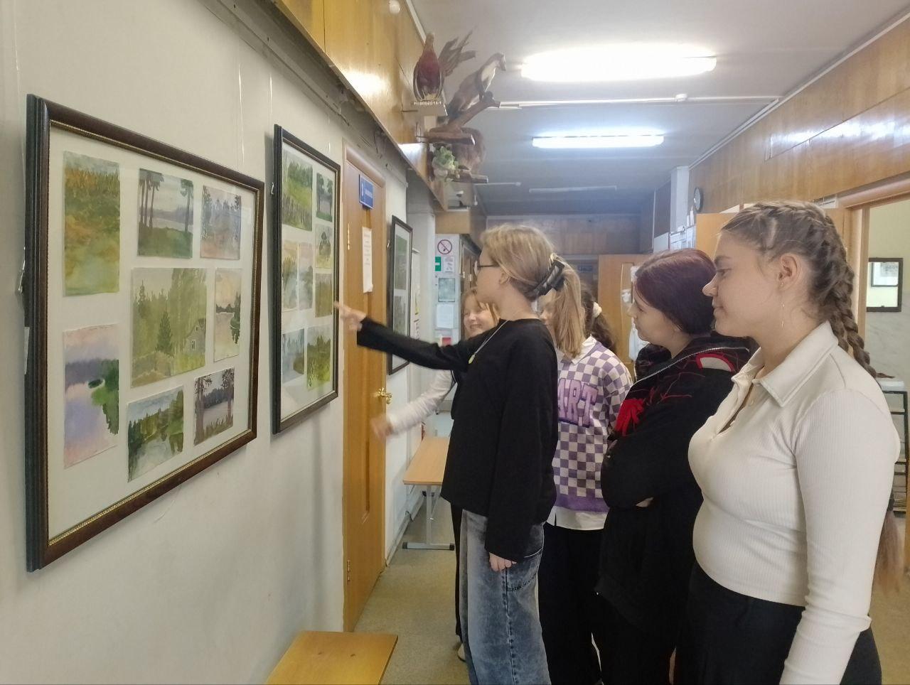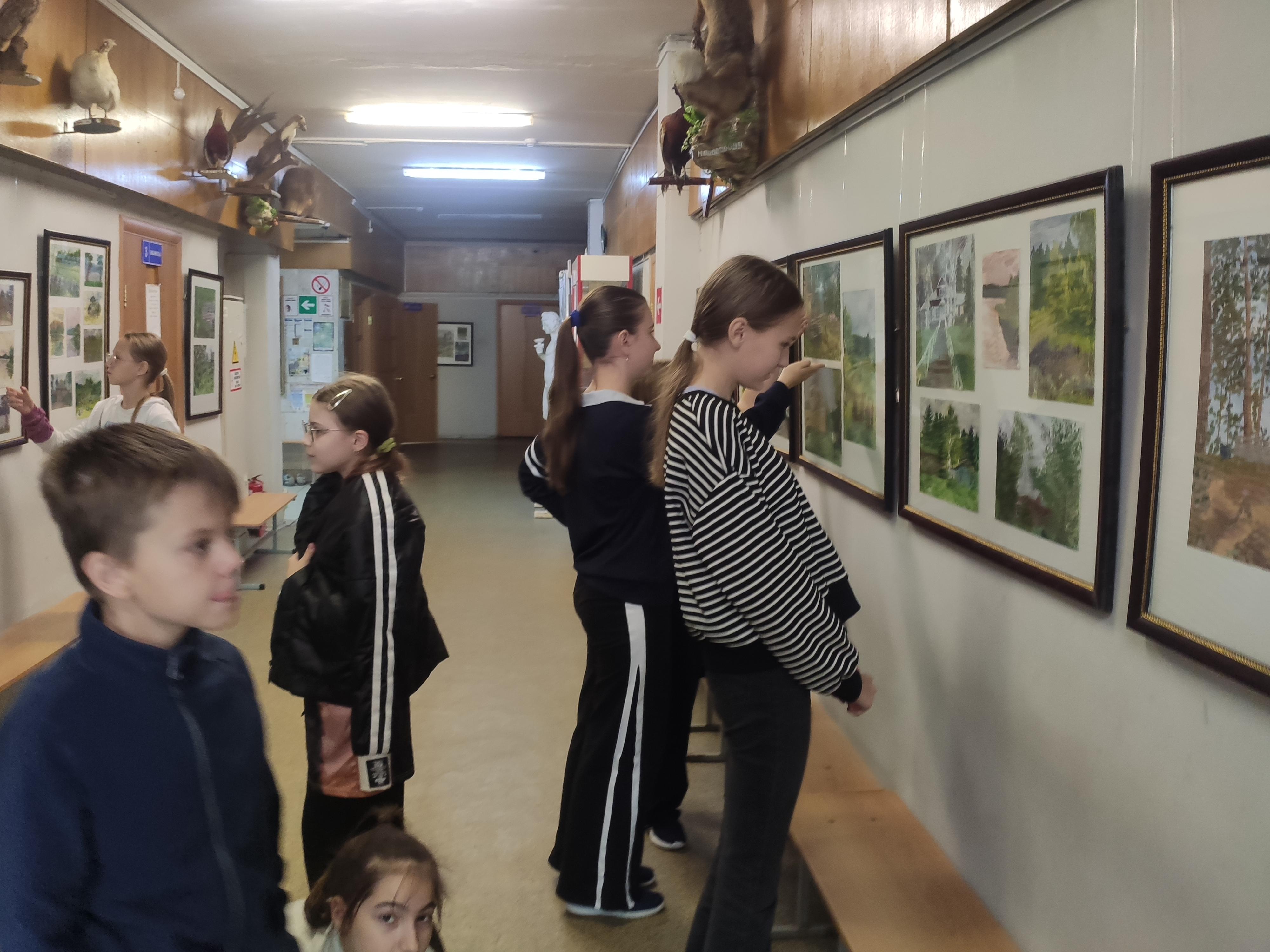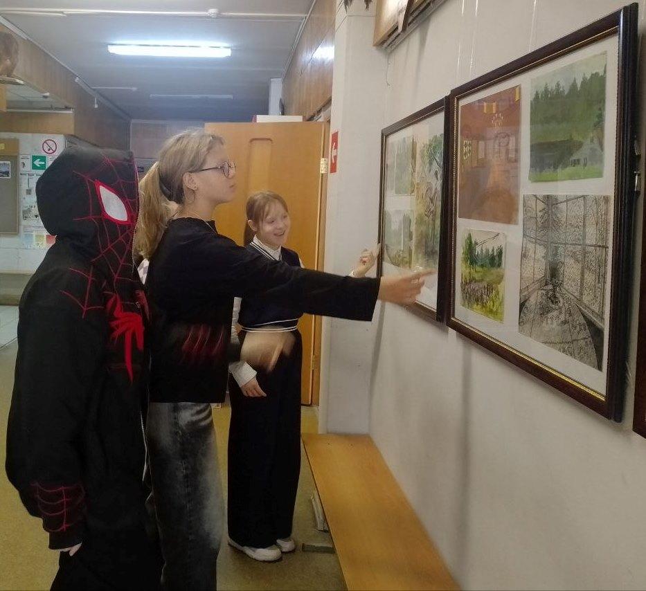 Обучающиеся школы с удовольствием рассматривают работы, а авторы показывают друзьям свои творения.
